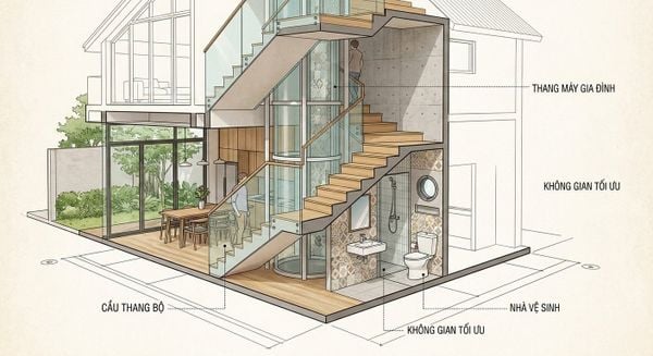 Hiện nay, nhiều gia đình lựa chọn lắp đặt thang máy gia đình ở giữa lòng thang bộ. Khi đó, phần diện tích dưới gầm thang bộ vẫn có thể được cải tạo thành nhà vệ sinh nhỏ, tạo nên một cụm công năng cực kỳ thông minh: